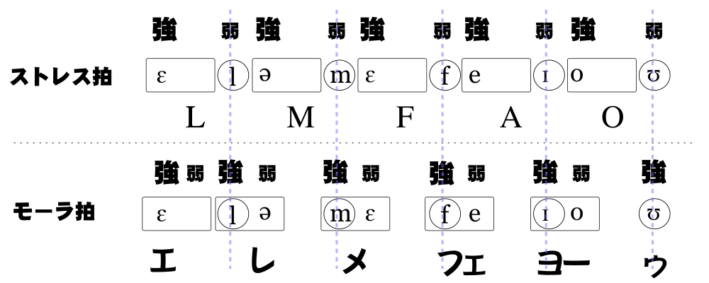 上記はストレス拍解釈の発音をモーラ拍リズム解釈で解釈し間違えた時の状態を図式化したものです。