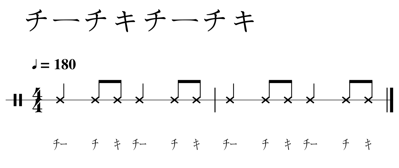 このリズムを譜面で表すと、いくつか複数の書き方あることに気付くでしょう。これを読む貴方はどうお考えになりますか。