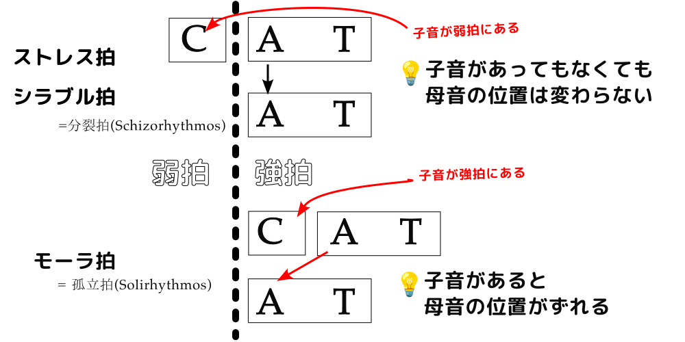ここに ストレス拍・シラブル拍には、時間の分割という感覚が発音構造自体に含まれており、モーラ拍には時間の分割という感覚がなく、分割の代わりにトリガ(強拍)が聴こえたことをきっかけにしその一定時間後に継続して発音を繋げる『継続』という時間概念を持っているという仮説が成立します。