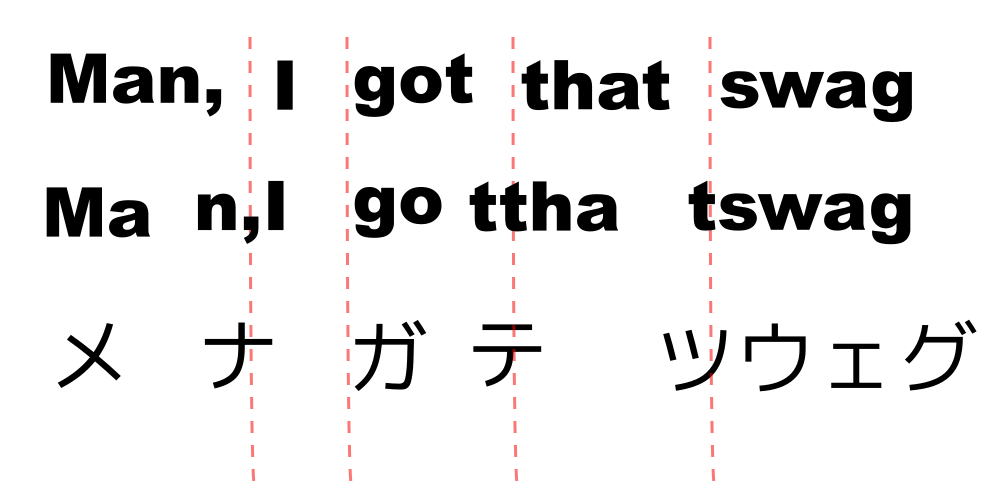 この音楽の歌詞の最初の部分をモーラ拍リズムで解釈すると『メナガテッスウェーッグ』と言っている様に聴こえます。これはストレス拍リズムでは『 man, I got that swag 』と解釈されます。この解釈の違いを図として表すと次の様になります。