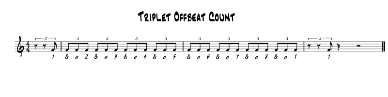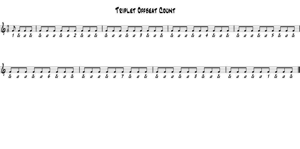 九連符オフビートカウントとは、三連符オフビートカウントを 3ⁿ 理論にしたがって三連符で二重の弱拍先行を構築したものです。 次の様に1拍3連符を先頭の音を変えながら3回読むことで9を表現します。
