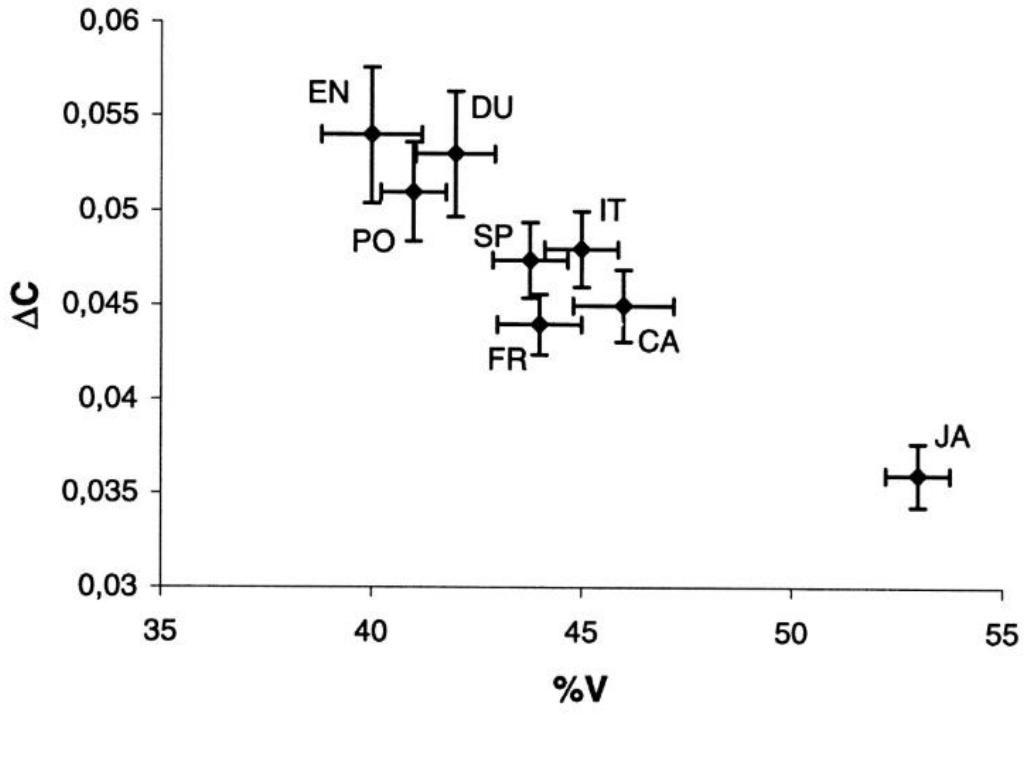 このグラフは、縦軸=ACが平均的な子音の長さ、横軸=%Vが母音の長さの平均的パーセンテージを表しています。ここから日本語だけが突出して長い母音を持っており、突出して短い子音を持っていることがわかります。特に母音の長さが50%を超えている言語は、8カ国語中1カ国JA=日本語だけということがはっきり見て取れます。