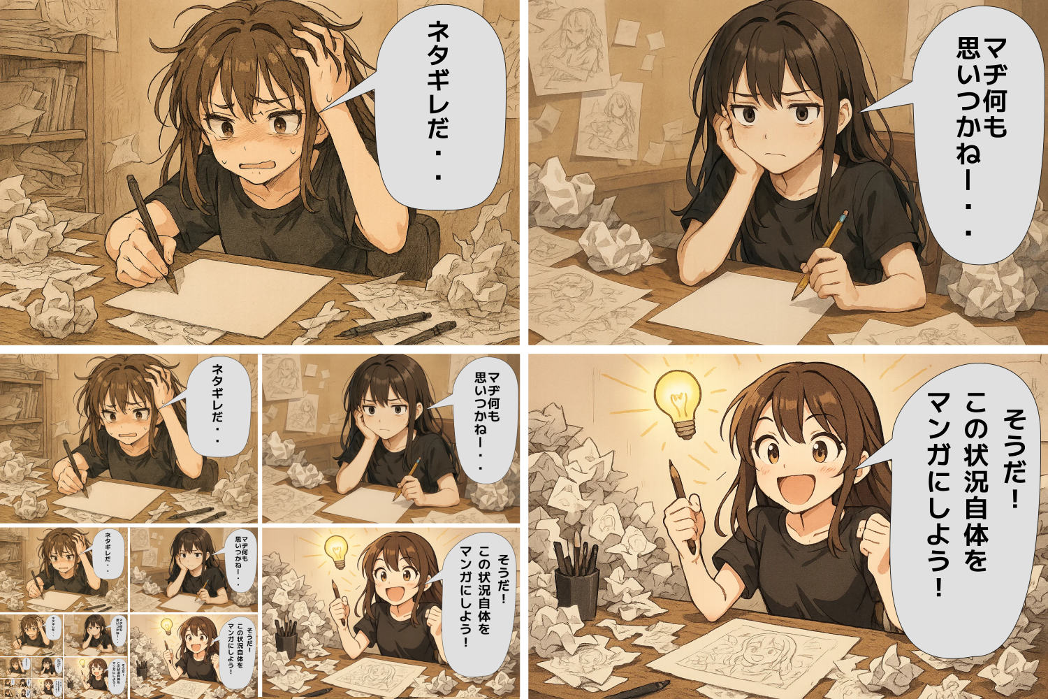 この漫画には、自分自身の状況をそのまま漫画にするという再帰的な自己言及性が表現されています。
