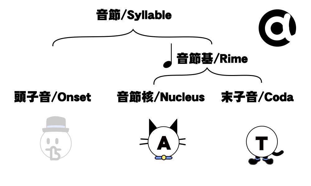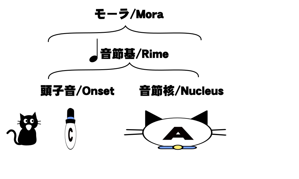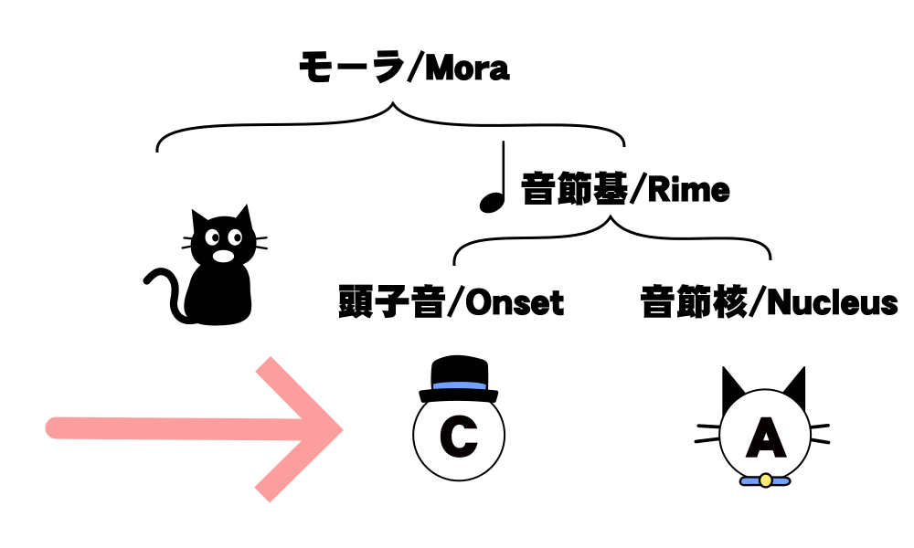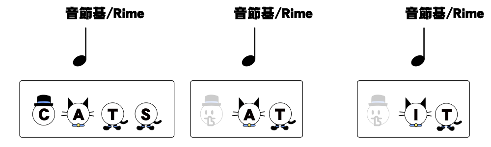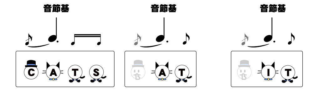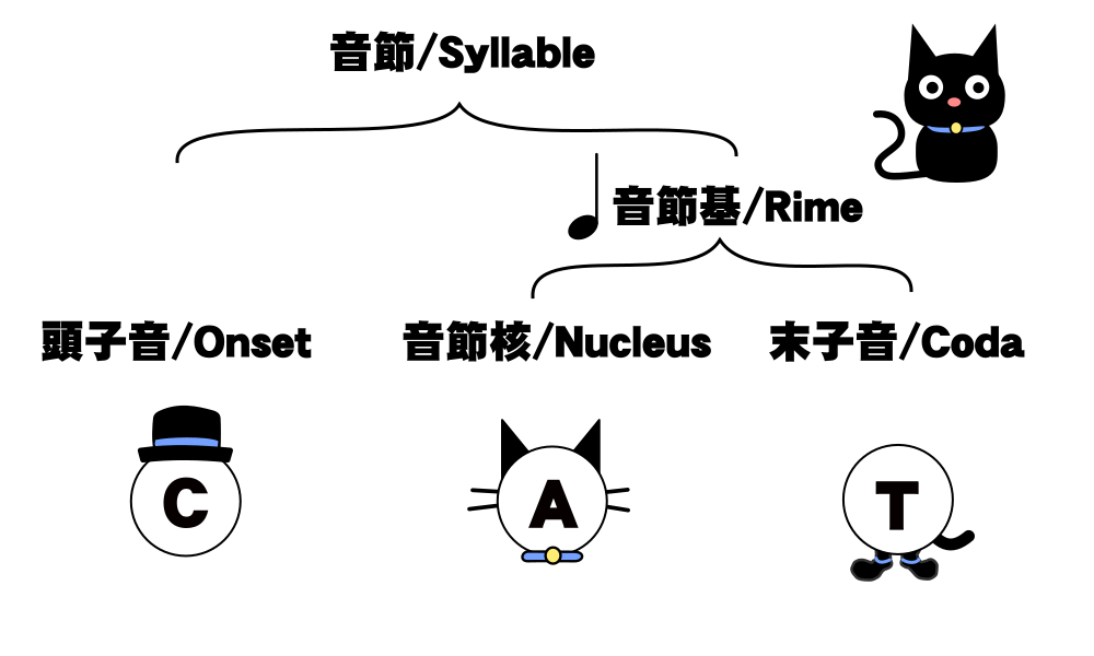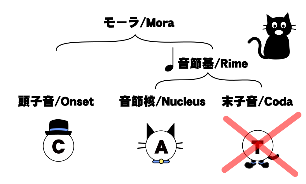 この図中で帽子が頭音節、猫が核音節、靴が末音節を表しています。