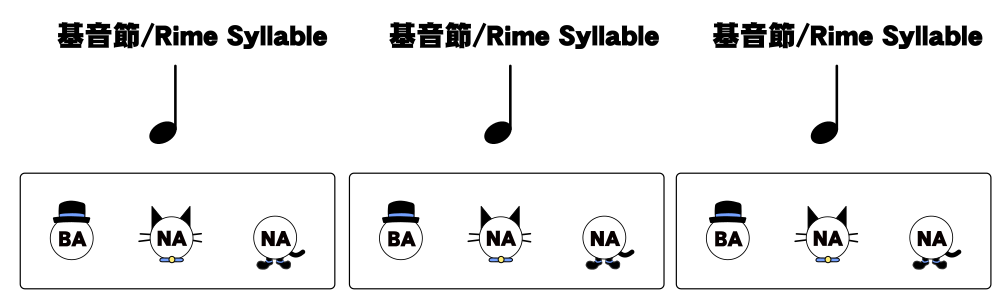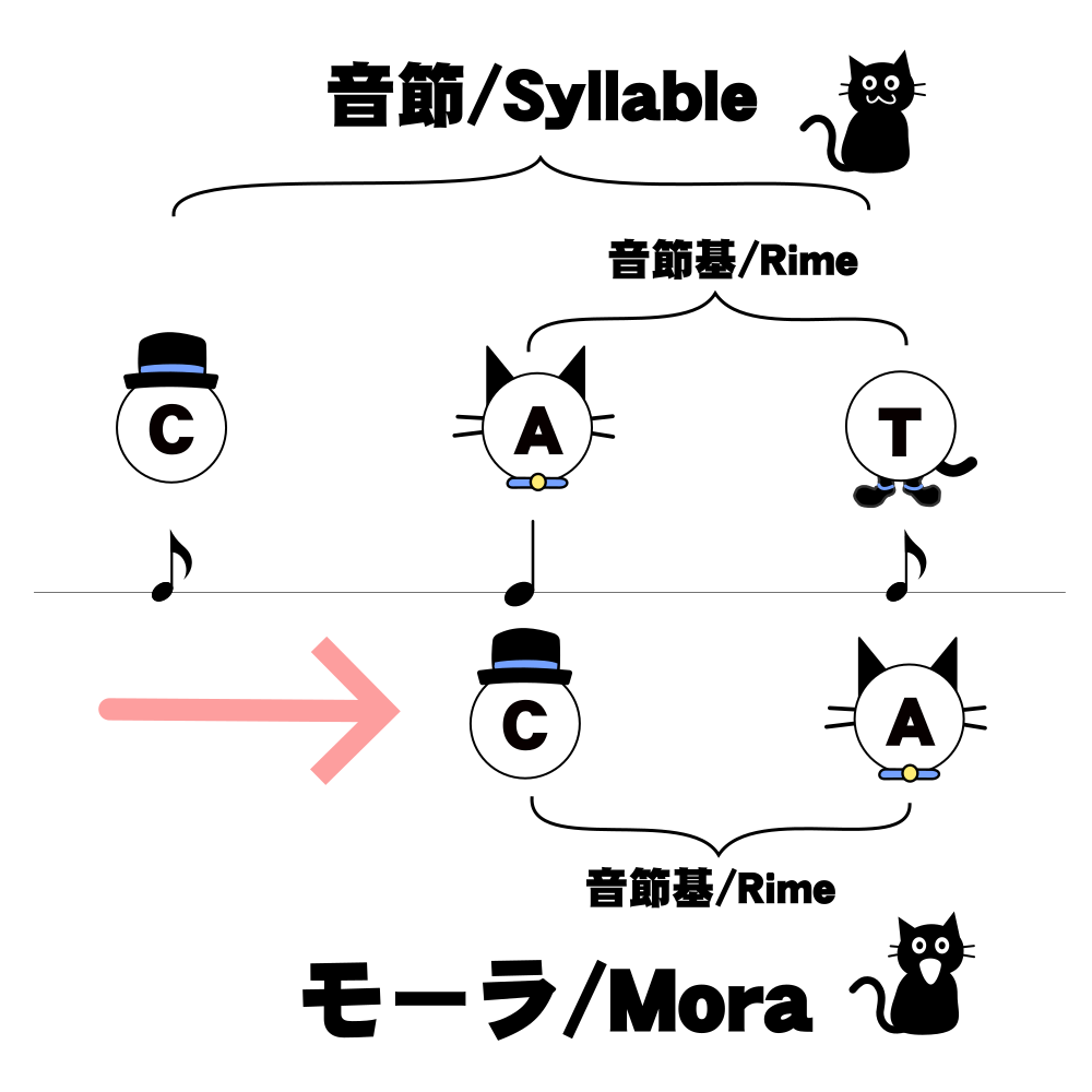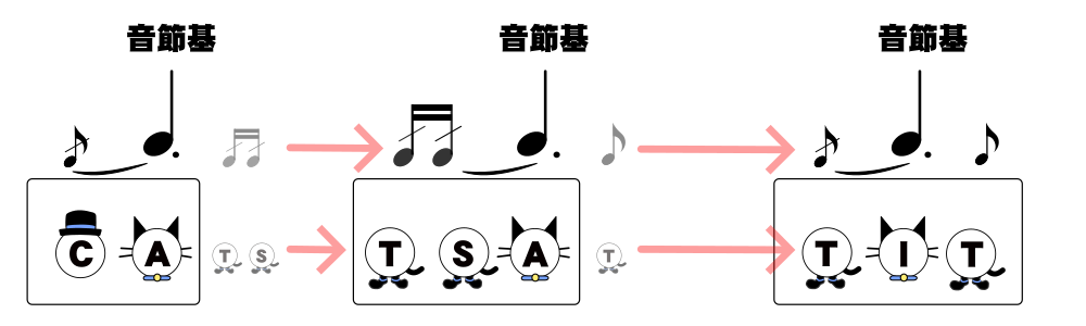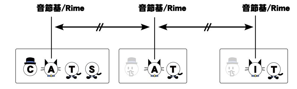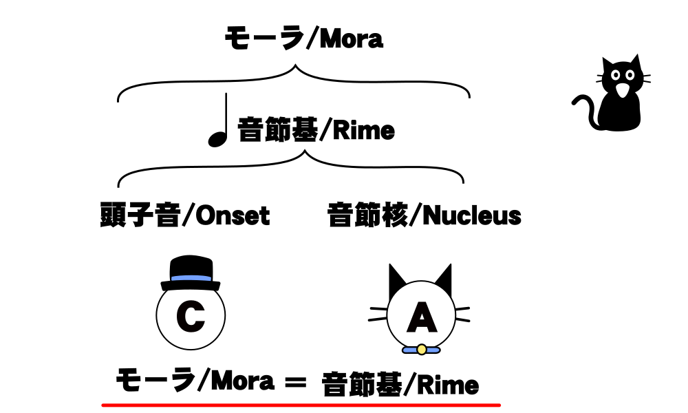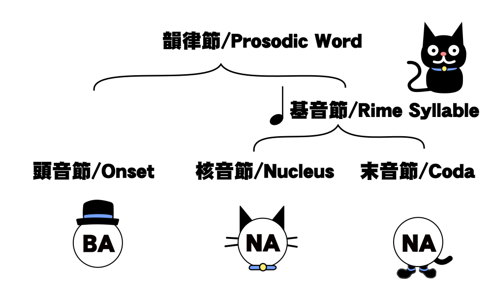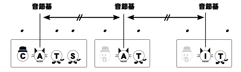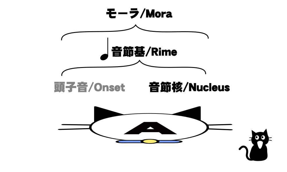 この図中で帽子が頭音節、猫が核音節、靴が末音節を表しています。