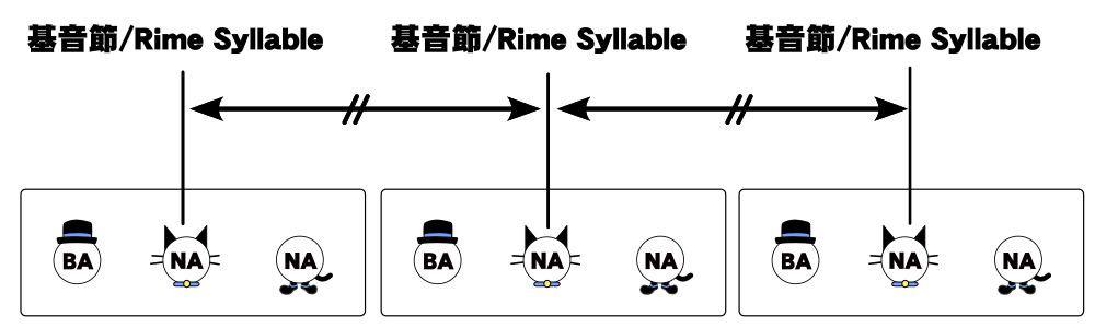 音節核と末子音は、シラブルの本体になっています。この本体を 音節基(Rime) と呼びます。