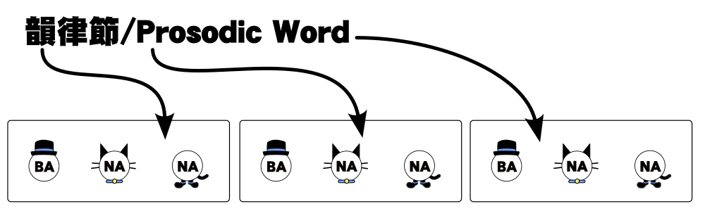 韻律節は、大抵単語と等しくなります。しかしこのあとで紹介する再韻律節化(Reprosodification)という法則が適用されることで一致しなくなることがあります。