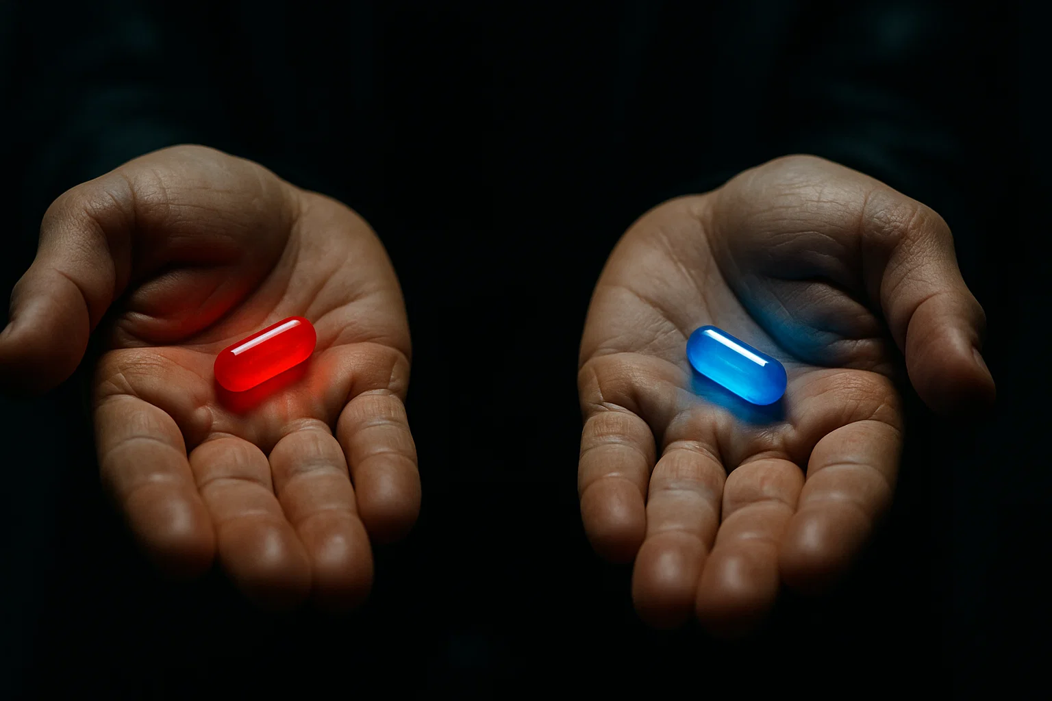 それは映画マトリックスに登場する赤いカプセルと青いカプセルの様です。もちろん、このまま縦乗りに気付かないで生きていくことも可能です。もしもここで、縦乗りに気付くことを選んだらどうなるでしょうか。 …縦乗りに気付くことにより大きな自由が得られると同時に、大きなリスクのある世界で生きていく事になります。