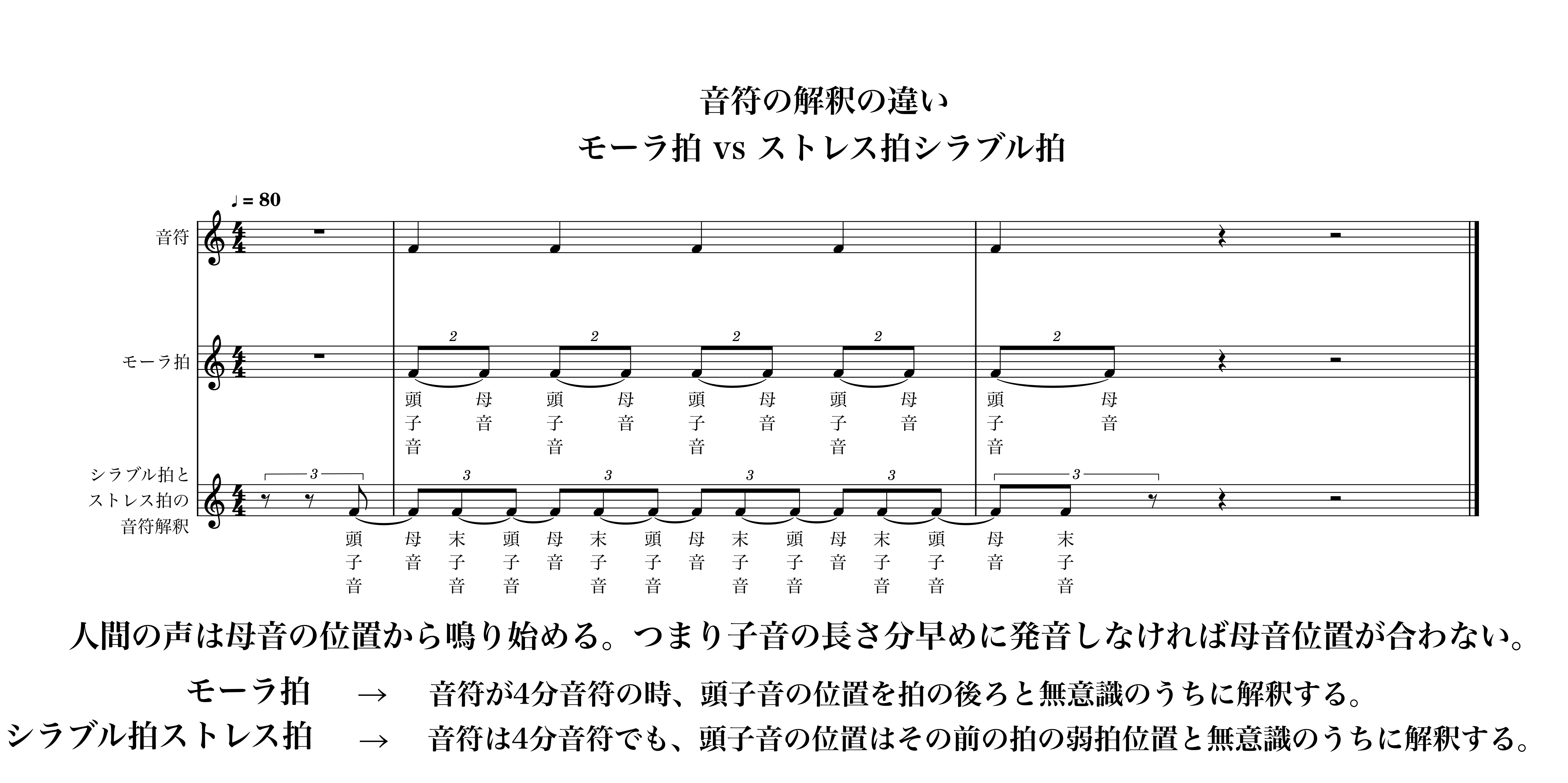 結論を先にいうと、何故日本人は2拍子を自然だと感じるのか ─── それは音節(モーラ)が頭子音と母音という2要素で構成されているからです。 そして何故日本人以外の人々は、3拍子を自然だと感じるのか ─── これは音節(シラブル)が頭子音・母音・末子音という3要素で構成されているからです。