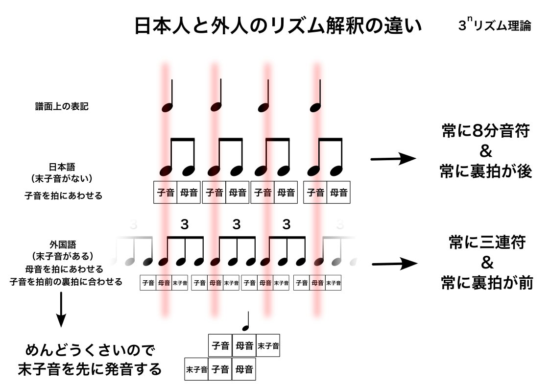 ─── つまり 「何故3だとグルーヴしやすいのか』 ─── この視点は実は日本のとても独特な視点であり、むしろ『何故2だとグルーヴしないのか』『何故日本語のシラブルの音素数は例外的に2なのか』『何故日本語はグルーヴしないのか』という視点のほうがより、この問題の本質をよく捉えていると言い換えることも出来ます。